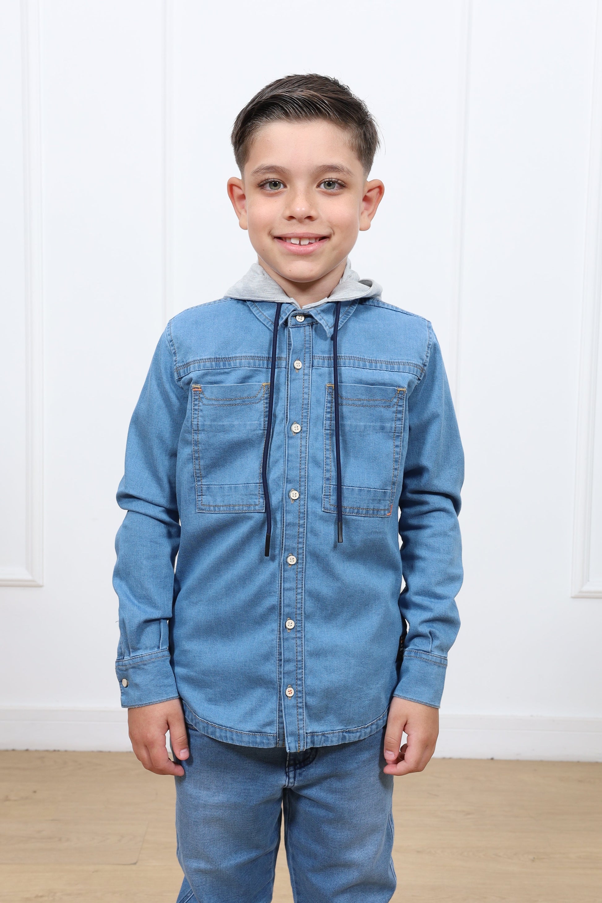 Camisa Arthur, manga larga con capucha esta confeccionada en denim rígido 100% algodón.